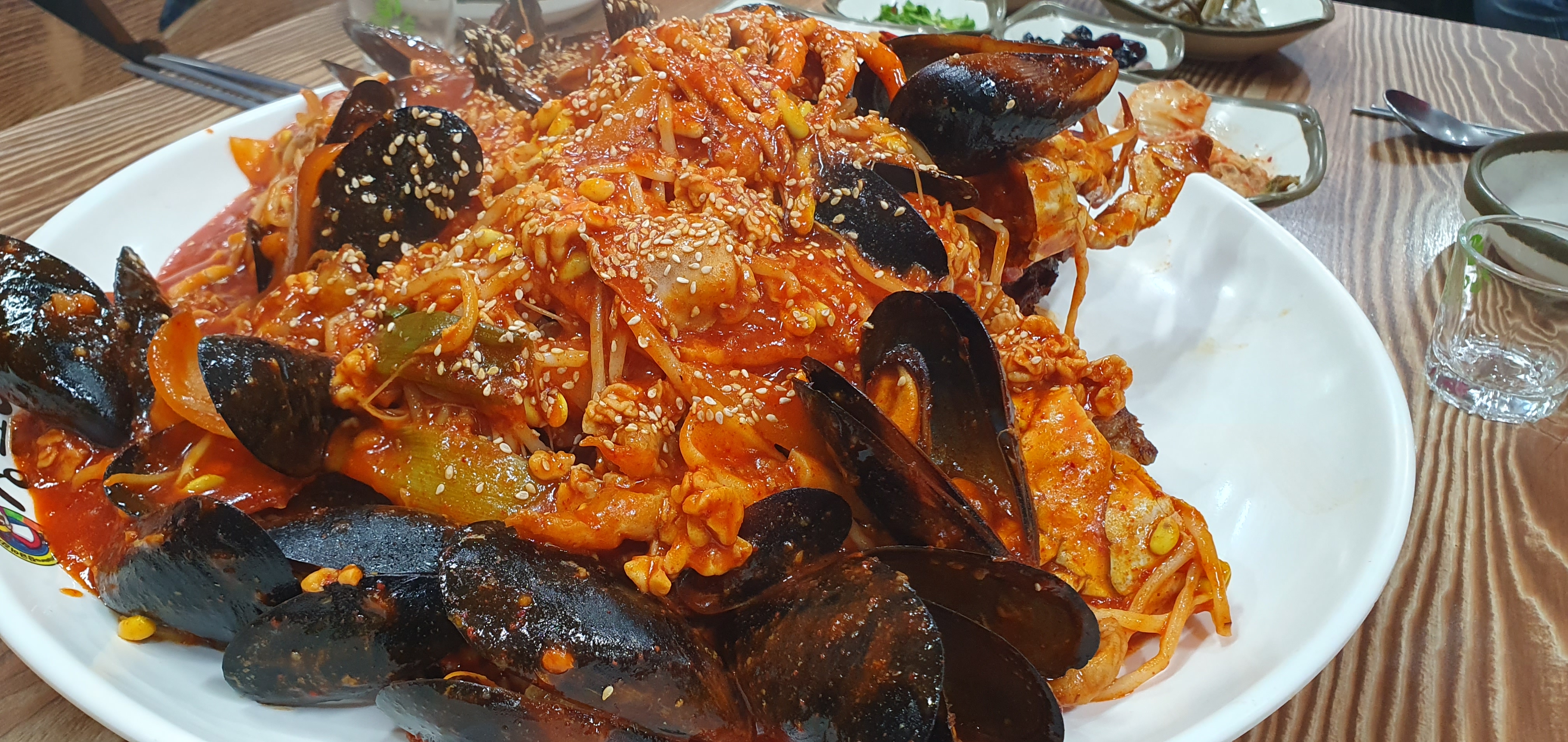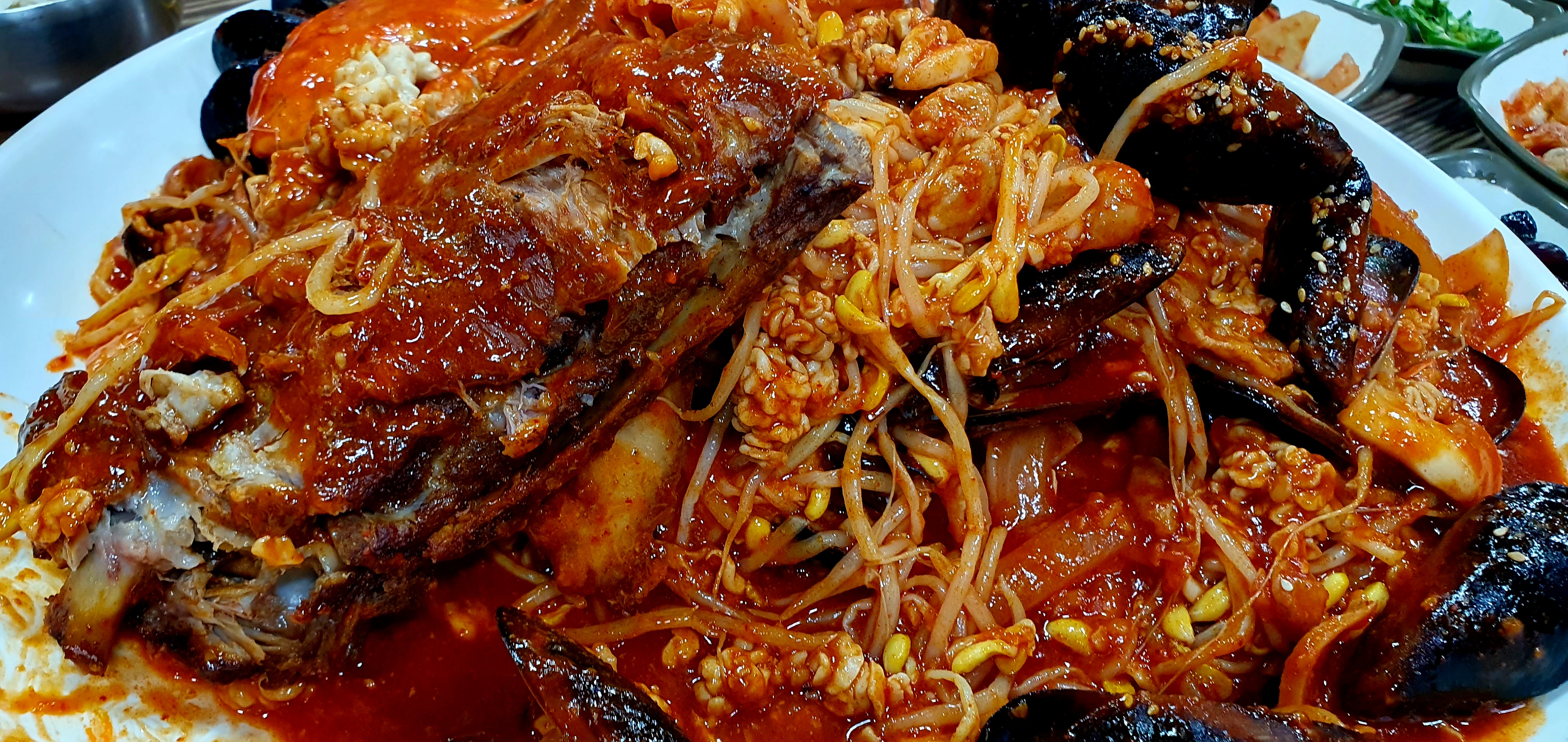 봉평맛집 장금이감자탕 식당에서 2차로 주문한 해물뼈찜은 양이 많으므로 이것저것 먹고싶다면 장금이감자탕 중, 해물뼈찜 중을 주문하면 4인이 푸짐하게 골고루 먹을 수있다.술안주로는 최고~~