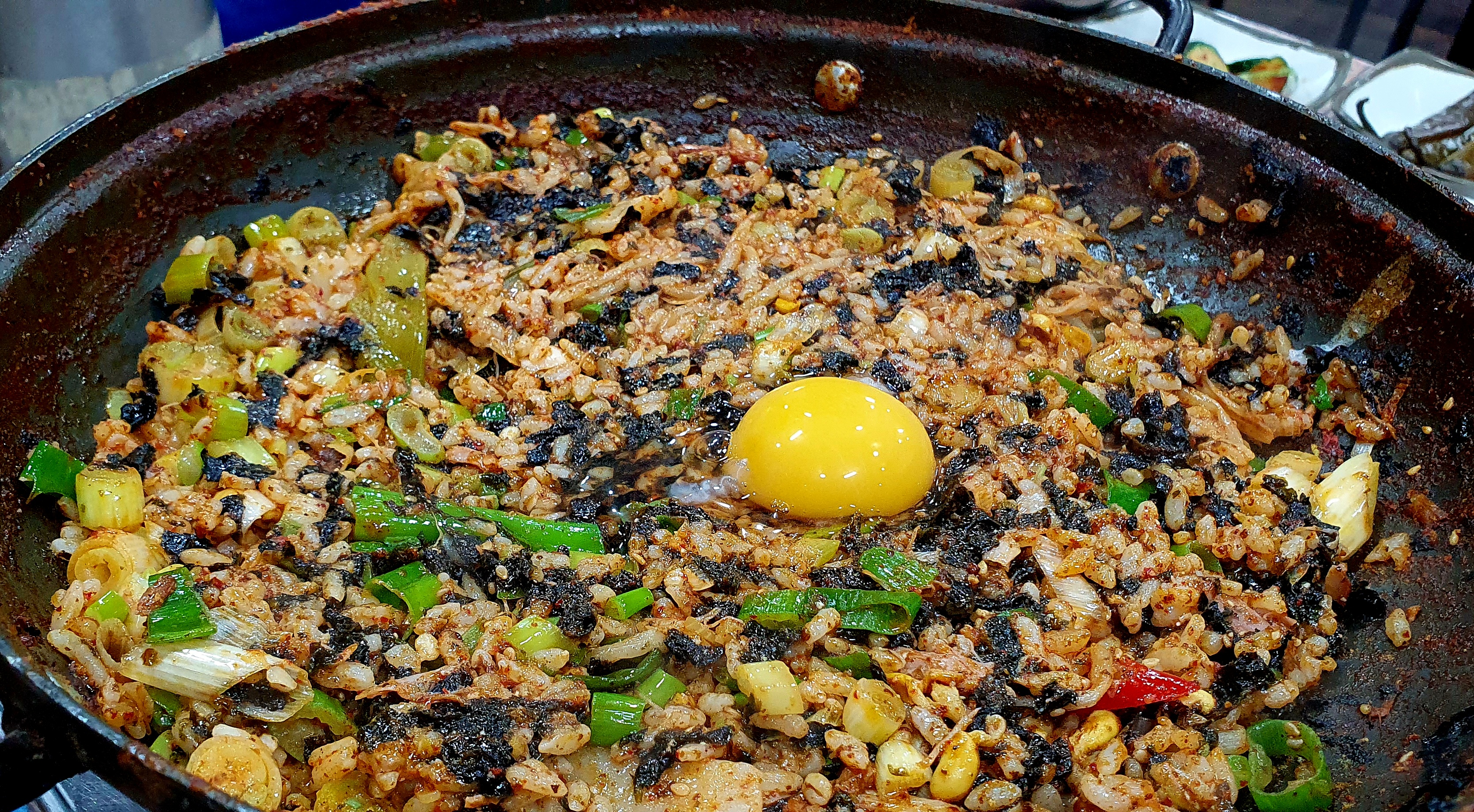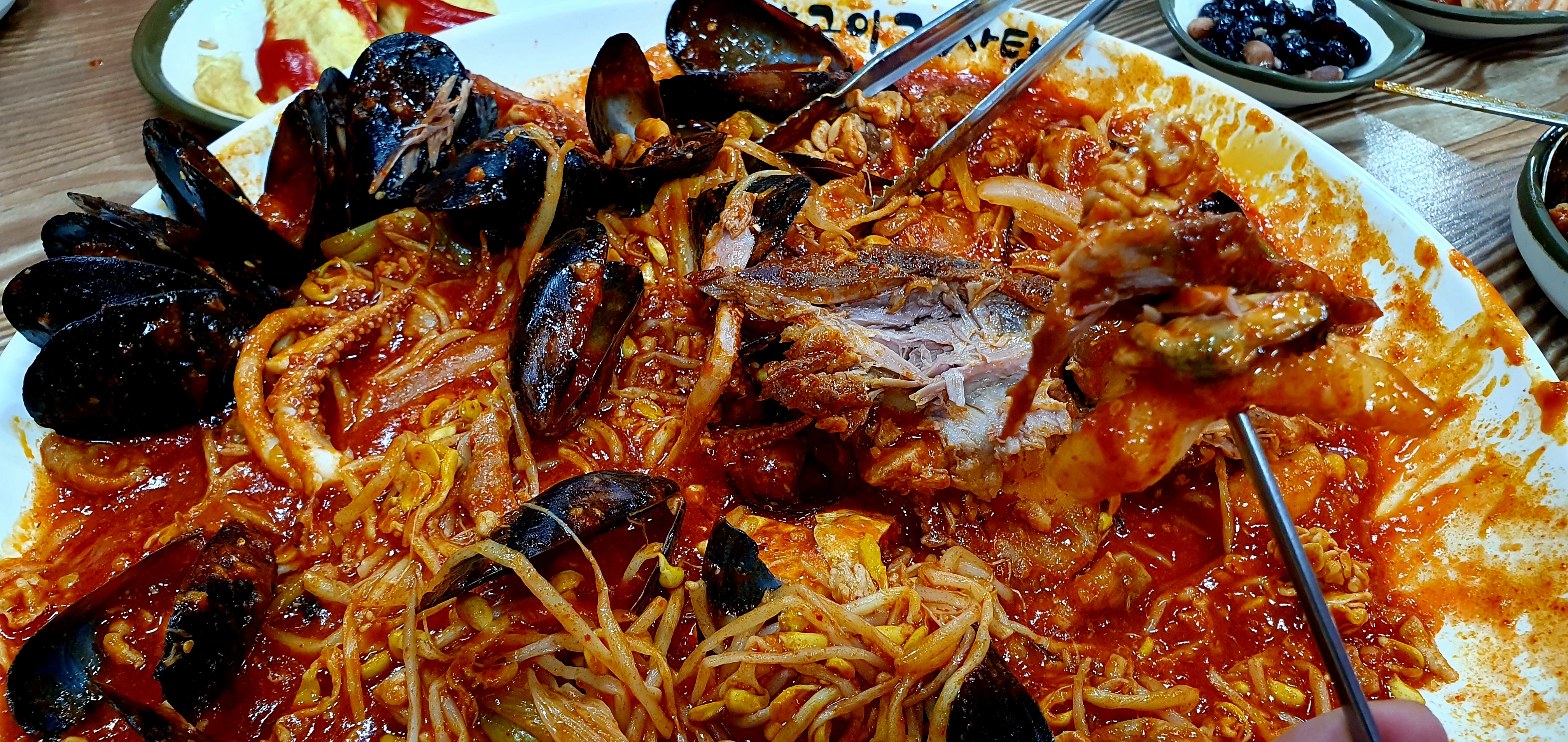 해물요리인 해물뼈찜을 거의 다 먹어갈때쯤 밥을 비벼먹는건 당연한 국룰....김가루가 많이 들어간건가? 생각했었는데 역시 비벼보니 그 정도는 들어가줘야 모양이 나는거였다. 살짝 눌어붙은 누룽지도 긁어먹는 재미도 있었다