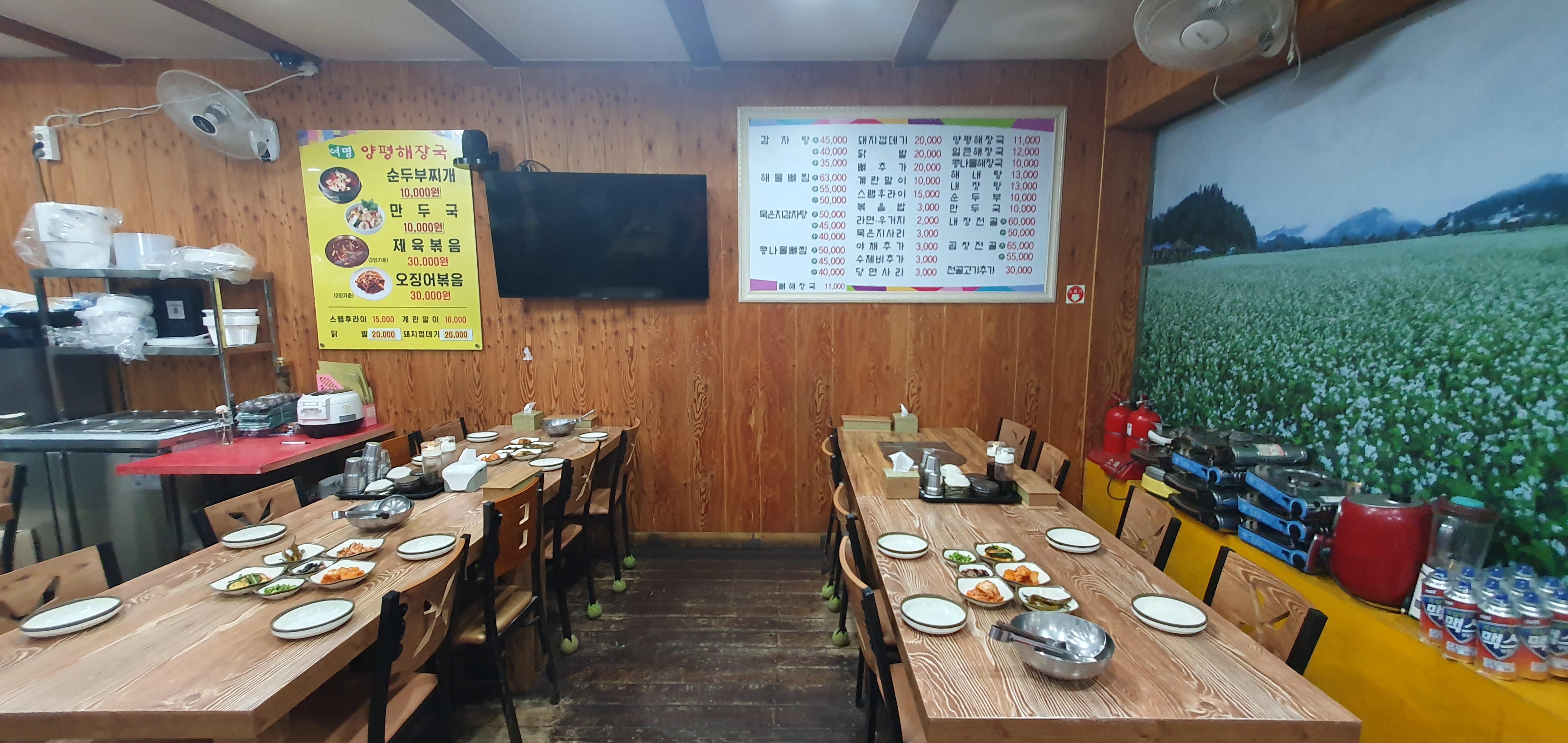 봉평은 메밀의고장 메밀꽃이 유명한 곳인만큼 큼직한 메밀밭 그림이 있어 식당안의 분위기가 아주 좋다.